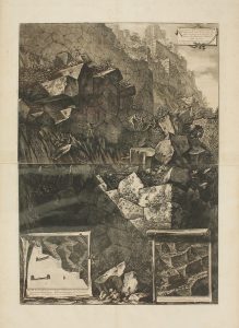 Papel verjurado con filigrana. Bellíssimo grabado firmado (dibujado y grabado) por Piranesi, que forma parte de la serie de ´Antichitá di Cora´ (1764). El grabado está dividido en tres figuras: la central, donde se ilustra la monumental muralla ciclópea que sustenta la fortificación en su parte superior; y dos figuras a manera de cartela, donde se representan las terrazas, galerías y accesos de la construcción. Algún punto de óxido y pequeñas rasgaduras marginales.