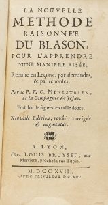 .1718.. LIBRO: .(HERÁLDICA).. .MENESTRIER, P. F. C.:. .LA NOUVELLE METHODE RAISONNEE DU BLASON POUR L´APPRENDRE D´UNE MANIERE AISÉE.. Lyon: Chez Louis Bruyset, 1718. 8º menor. Frontis grabado + 4 h. + 298 p. + 15 h. y 32 lám. grabadas con...