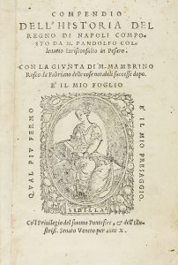 .1557 ca.. LIBRO: .(HISTORIA).. .COLLENUTIO, PANDOLFO:. .COMPENDIO DELL´HISTORIA DEL REGNO DI NAPOLI COMPOSTO DA.... Veneto: giunta di Mambrino, aunque no consta año, la decicatoria al duque de Urbino está fechada en 1557. 8º menor. 6 h. + 344 p....