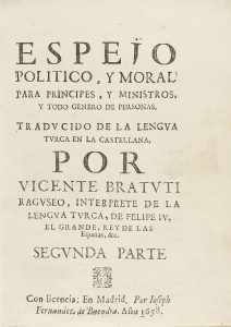 .1658.. LIBRO: .(POLÍTICA).. .BRATUTI RAGUSCO, VICENTE:. .ESPEJO POLÍTICO, Y MORAL PARA PRINCIPES, Y MINISTROS, Y TODO GENERO DE PERSONAS, traducido de la lengua turca en la castellana por Vicente Bratuti...SEGUNDA PARTE.. Madrid: Joseph Fernandez...