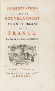 .1765.. LIBRO: .(FRANCIA-HISTORIA).. .ARGERNSON, LE MARQUIS D´:. .CONSIDÉRATIONS SUR LE GOUVERNEMENT ANCIEN ET PRESENT DE LA FRANCE.. Amsterdam: Chez Marc Michel Rey, 1765. 8º. 8 h. + 328 p. Enc. en pasta española, tejueo, lomera cuajada, cortes...
