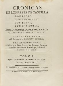 .1779-1780.. LIBRO: .(HISTORIA-MONARQUÍA).. .LOPEZ DE AYALA, PEDRO:. .CRONICAS DE LOS REYES DE CASTILLA DON PEDRO, DON ENRIQUE II, DON JUAN I Y DON ENRIQUE III.. Madrid: Imp. Antonio de Sancha, 1779-1780. 2 vol. en 4º. I: 1 h. + LII + 612 p....
