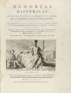 .1779-1792.. LIBRO: .(BARCELONA-MARINA).. .CAPMANY Y DE MONTPALAU, ANTONIO:. .MEMORIAS HISTORICAS SOBRE LA MARINA COMERCIO Y ARTES DE LA ANTIGUA CIUDAD DE BARCELONA.. Barcelona: Imp. Antonio de Sancha, 1779-1792. 4 vol. en 4º. I: 3 h. + XXIV p.+ 1...