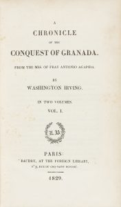 .1829.. LIBRO: .(HISTORIA).. .IRVING, WASHINGTON:. .A CHRONICLE OF THE CONQUEST OF GRANADA.. Paris: Baudry, at the foreign library, 1829. 2 vols. 8º. I: VIII + 435 p. II: VIII + 454 p. Buen ejemplar de la Primera edición parisina. 2 vol. enc. en...