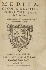 .1582.. LIBRO: .(MÍSTICA).. .STELLA, DIEGO DE:. .MEDITACIONES DEVOTISSIMAS DEL AMOR DE DIOS. Hechas por.... Salamanca: Pedro de Lasso, 1582. 8º menor. Portada con escudo xilográfico. Capitales xilografiadas. Texto con apostillas marginales....