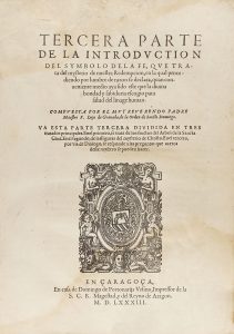 .1583.. LIBRO: .(HUMANIDADES).. .GRANADA, F. LUYS DE:. .TERCERA PARTE DE LA INTRODUCTION DEL SYMBOLO DE LA FE, QUE TRATA DEL MYSTERIO DE NUESTRA REDEMPCION.... Çaragoça: Domingo de Portonariis Ursino, 1583. 4º mayor. 150 p. +1 h.+ 206 p. + 2 h....