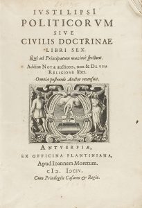 Politicorum notae, et de una Religione liber; De una religione, adversus, adversus dialogistam liber.. [Sigue:] .IUSTI LIPSI MONITA ET EXEMPLA POLITICA LIBRI DUO QUI VIRTUTES ET VITIA PRINCIPUM SPECTANT.. Id., 1605. 4 h. + 213 p. + 3 h. [Sigue:]. LEGES REGIAR ET LEGES X. VIRALES. I. LIPSII OPERÂ STUDIOSÈ COLLECTAE.. .Editio ultima.. Id., 1601. 8 h. Cada parte con portada propia con grabado tipográfico del emblema de la Officina Plantiniana. Capitales, culs-de-lampe. Texto con apostillas marginales, amplios márgenes. Intermitentes galerías marginales que no afectan texto, alguna p. tostada. Enc. en pleno pergamino de época, lomera rotulada com pequeña rasgadura en su parte superior, cantos rozados. Justus Lipsius (1547-1606) fue un humanista de origen belga, que realizó una serie de escritos destinados a reavivar los clásicos estoicistas de forma que fueran compatibles con el catolicismo. CCPB 337078-X; CCPB 496933-2; CCPB 128677-3.