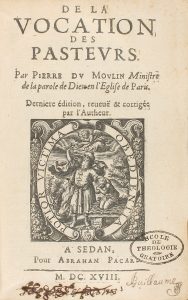 parte de su padre Abraham. Sello húmedo de anterior poseedor y marcas de lápiz. Enc. en pergamino de época. Pierre Moulin fue un destacado estudioso educado en el protestantismo. Su prolífica obra va encaminada a señalar y denunciar los excesos de la iglesia católica, hecho que le puso en peligro en Francia y le hizo regresar a la protección de Inglaterra.