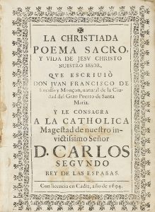 .1694.. LIBRO: .(RELIGIÓN).. .ENCISO Y MONÇON, JUAN FRANCISCO:. .LA CHRISTIADA POEMA SACRI, Y VIDA DE JESU CRHISTO NUESTRO SEÑOR, QUE ESCRIVIÒ DON.... Cádiz: s.imp., 1694. 8º mayor. 4 h. + 225 p. Portada en orla xilográfica, escudo...