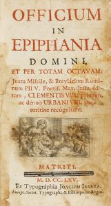 .1765.. LIBRO: .(RELIGIÓN-ENCUADERNACIÓN).. .OFFICIUM IN EPIPHANIA DOMINI. ET PER TOTAM OCTAVAM.... Matriti: Typ. Ibarra, 1765. 12º. 259 páginas. Portada a dos tintas con calcografía, con señal de óxido y rasgadura en el margen interior....