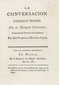 .1782.. LIBRO: .(MORAL-FILOSOFÍA).. .CARACCIOLO, MARQUÉS:. .LA CONVERSACION CONSIGO MISMO.. Trad. Francisco Mariano Nipho. Madrid; Imp. Miguél Escribano, 1782. 12º. XXIV + 387 p. + 2 h. Enc. en pergamino. Primera edición de esta obra, una de la...