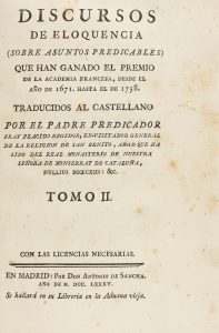 .1785.. LIBRO: .(HUMANIDADES).. .DISCURSOS DE ELOQUENCIA (SOBRE ASUNTOS PREDICABLES) QUE HAN GANADO EL PREMIO DE LA ACADEMIA FRANCESA, DESDE EL AÑO DE 1671 HASYA EL DE 1758.. Trad. por fray Placido Regidor. Madrid: Antonio de Sancha, 1785. 2 vols....