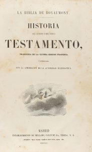 .1855.. LIBRO: .(RELIGIÓN).. .LA BIBLIA DE ROYAUMONT. HISTORIA DEL ANTIGUO Y DEL NUEVO TESTAMENTO. Traducida de la ultima edición francesa.... Madrid: Establecimiento Mellado, 1855. 4º. XVI + 1 h. + 568 p. Profus. ilustr. con grabados en el texto....