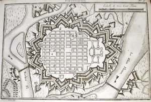151 [front. incl.]-[9] pp.; 12 h.-t. (lég. bruni -qqs pp. plus fortement-, pet. rouss., mouill.). Rel. de l'époque : plein veau, dos fleuronné doré à nerfs, tr. jaspées de rouge (pet. manques notamment au dos, mouill., mention d'app. ms. et note moderne à la garde sup.). Relié avec du même auteur, mêmes lieu d'éd., éd. et cond. : Traité de l'architecture militaire qui enseigne la construction de tous les ouvrages de fortification [...]. 1741, titre gravé-[10]-166-[2] pp.; 24 h.-t. Édition originale de ces deux ouvrages généraux et théoriques faisant partie du "Cours de la science militaire à l'usage de l'infanterie, de la cavalerie, de l'artillerie, du génie et de la marine", collection parue de 1740 à 1757 et rédigée par l'ingénieur ordinaire de Charles III, Bardet de Villeneuve. Illustré d'un frontispice, d'un titre gravé et de respectivement 12 et 24 planches dépliantes in fine de chaque ouvrage ainsi que de 2 vignettes de titre identiques. # Cicognara 415 (Architecture civile); # pas dans Berlin Kat., Fowler, Brunet, Graesse.