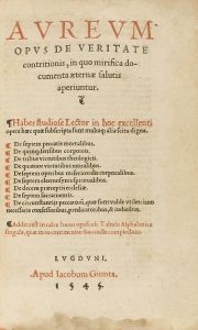.1545.. LIBRO: .(GÓTICO).. .VIVALDI, GIOVANNI LUDOVICO:. .AUREM OPUS DE VERITATE CONSTITIONIS, IN QUO MIRIFICA DOCUMENTA AETERNAE SALUSTIS CONTRITIONIS, IN QUO MIRIFICA DOCUMENTA AETERNAE SALUTIS APERIUNTUR.. Lyon: Apud Iacobum Giuntam, 1545. 8º...