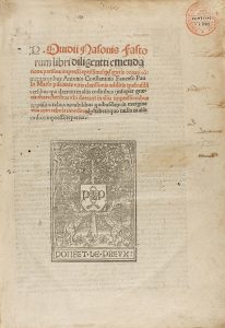 (1520 ca.). 4º mayor. 14 h. + CCLXII fol. Texto con apostillas marginales y en dos tipografías, una un poco más grande para el texto original de Ovidio y otra algo menor para los comentarios de Paolo Marso y Antonio Constanti. Portada a dos tintas con grabado calcográfio alegórico, con dos pequeñas erosiones. Pequeña rasgadura sin pérdida en el folio CCXXXVI. Varios errores de foliación. Anotaciones manuscritas marginales y subrayados de antiguo poseedor. Enc. en plena piel con hierros secos en ambos planos, nervios, consolidada de antiguo, lomera algo rozada. Se trata del calendario poético que Ovidio escribió en la madurez de su vida, describe las fiestas romanas y las leyendas que van relacionadas con ellas. Aunque escribió doce libros, uno para cada mes del año, solo nos han llegado los seis primeros. Exlibris de anterior poseedor y sello de caucho.