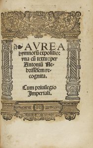 (él dice que el pliego D es de 6 h., pero aquí tiene 8). Palau 189307. CCPB 15525-X.[Sigue:] .AUREA HYMNORU[M] EXPOSITIO: UNA [CUM] TEXTU: PER ANTONIU[M] NEBRISSE[N]SEM RECOGNITIA. .Lucronio [Logroño]: Michaelis de Eguia, 1528 (en colofón). 66 h. Portada en orla xilográfica. Palau 189252. [Sigue:] .ORATIONES AD PLENUM COLLECTE SUMMAQ[UE] DILIGENTIA EMENDATE: IN SUPER ET ALIQUE Q[UE] DEFUERAT ADDITE: QUE P[ER] TOTUM ANNUM I[N] SANCTA ECCLESIA CANTANTUR. .Compluti: Michaelis de Eguia, 1528 (en colofón). 44 h. Portada en orla xilográfica. Rasgadura sin pérdida en d4, ha perdido la mitad inferior de la hoja de colofón (aunque este completo). Palau 189299. [Sigue:] .ANGELI POLITIANI POETE CARMEN IN OBITU MICHAELIS VERINI DISERTISSIMI ADOLESCENTIS. .[Hispali: Juan Cromberger, 1535.] 14 h. Ha perdido la primera hoja además de las dos últimas (colofón incluido). CCPB 21447-7. Hay anotaciones manuscritas de época en las guardas, y ocasionalmente, en los márgenes. Algún cerco de humedad. Enc. las cuatro obras juntas en un vol. en pergamino de época, algo mareado, ha perdido una pequeña parte del lomo. Rarísimo conjunto de cuatro obras igualmente raras. Las tres primeras del insigne Antonio de Nebrija y del mismo impresor en dos lugares diferentes, Logroño y Alcalá de Henares (Compluta). El cuarto impreso del poeta italiano Angelo Poliziano en una edición del igualmente apreciado impresor sevillano J. Cromberger.