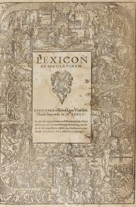 .1537.. LIBRO: .(GRAMATICA).. .LEXICON GRAECOLATINUM.. Basieae: Officina Ioan Vualderi, 1537. 4º mayor. 2 h. + 1910 col. + 1 b. [Sigue:] .FARRAGO LIBELLORUM QUOS OMNIUM MAXIME GRAECARUM LITERARUM CANDIDATIS LECU FRUGIFEROS FORE DUXIMUS. .Con portada...