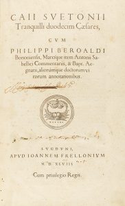 .1549.. LIBRO: .(CLÁSICOS-HISTORIA).. .SUETONIO TRANQUILO, CAYO:. .CAII SUETONNI TRANQUILLI DUODECIM CAESARES CUM PHILIPPI BEROALDI.... Lugduni: apud Ioannem Frelloniium, 1549 (lugar, impresor y año en portada y colofón). Folio. 40 + 761 p....