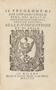 .1554.. LIBRO: .(LITERATURA ITALIANA).. .FIORENTINO, GIOVANNI:. .IL PECORONE DI SER... NEL QUALE SI CONTEGONO CINQUANTA NOVELLE ANTICHE BELLE D´INVENTIONE ET DI STILE.. Milano: Giouanni Antonio, 1554. 8º menor. Portada + 227 fol. + colofón. Bello...