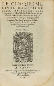 .1555.. LIBRO: .(CABALLERÍAS).. .[RODRIGUEZ DE MONTALVO, GARCI]; HERBERAY, NICOLAS DE [TRAD.]:. .LE CINQIESME LIVRE D´AMADIS DE GUALE, mis en francoys par le.... Paris: Iean Longis, 1555. 8º. Portada con xilografía tipográfica. 6 h. + CXCIIII...