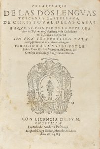 .1583.. LIBRO: .(LINGÜÍSTICA).. .CASAS, CRISTOVAL DE LAS:. .VOCABULARIO DE LAS DOS LENGUAS TOSCANA Y CASTELLANA DE.... Sevilla: Andrea Pescioni, 1583. 8º mayor. 224 h. (sin paginar). Grabado tipofráfico en la portada. Tenue cerco de humedad en...
