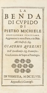 .1648.. LIBRO: .(LITERATURA).. .MICHELE, PIETRO:. .LA BENDA DI CUPIDO.. Venetia: Imp. Guerigli, 1648. 8º menor. .PARTE PRIMA. .6 fol. + 6 h. + 168 p. [Sigue:] .PARTE SECUNDA.. 4 h. + de 165 p. a 240 p. [Sigue:] .PARTE TERZA. .6 h. + de 243 p. a 348...
