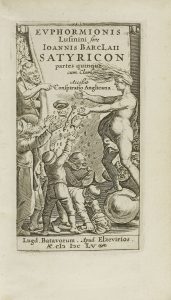.1655.. LIBRO: .(LITERATURA CLÁSICA).. .BARCLAII, IOANNIS:. .EVPHORMIONIS LUSININI... SATIRICON partes quinque.. Lugd. Batavorum: Apud Elzevirios, 1655. 8º menor. 6 h. + 568 p. Portada grabada. Cabeceras y capitales xilografiadas. Enc. en pleno...