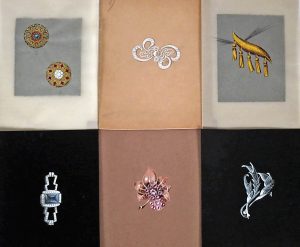 documentation aquarellée présentant des centaines de projets de boucles d'oreilles (+/- 90 feuilles), bagues (+/- 80 feuilles et souvent plusieurs projets par feuille), broches, boucles de ceinture ou boutons de manchettes (+/- 55 feuilles), bracelets (14 feuilles), colliers (6 feuilles), etc. Projets très finement peints selon la technique joaillière du "gouaché" : une peinture le plus souvent à l'échelle et qui laisse apparaïtre chaque détail du futur bijou (en or, argent, pierreries) permettant de visualiser au mieux le bijou à produire.