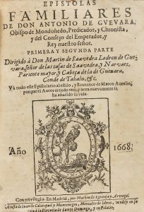 .1668.. LIBRO: .(LITERATURA).. .GUEVARA, ANTONIO DE:. .EPISTOLAS FAMILIARES DE... OBISPO DE MONDOÑEDO... PRIMERA Y SEGUNDA PARTE.. Madrid: Imp. Matheo de Espinosa y Arteaga, 1668. 8º mayor. 6 h. + 705 p. Texto a dos columnas y con apostillas...