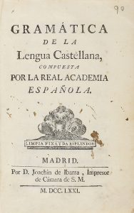 .1771.. LIBRO: .(GRAMÁTICA CASTELLANA).. .GRAMÁTICA DE LA LENGUA CASTELLANA, COMPUESTA POR LA REAL ACADEMIA ESPAÑOLA.. Madrid: Joaquin de Ibarra, 1772. 8º menor. 7 h. + XXII + 376 p. PRIMERA EDICIÓN. Grabado tipográfico en la portada. Alguna...
