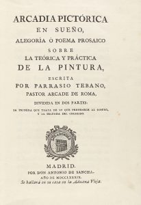 .1789.. LIBRO: .TEBANO, PARRASIO:. .ARCADIA PICTORICA EN SUEÑO, ALEGORIA O POEMA PROSAICO SOBRE LA RETÓRICA Y PRACTICA DE LA PINTURA.. Madrid: Antonio de Sancha, se hallará en su casa de Aduana Vieja, 1789. 8º mayor. 6 h. + 323 p. Enc. de época...