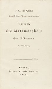 con papel al agua. Presentamos la PRIMERA EDICIÓN de esta obra, sin duda la más importante de Goethe en el ámbito científico. Autor polifacético, máximo exponente de la intelectualidad romántica. Obra capital de la biología botánica, en la que Goethe desarrolla la metamorfosis de las plantas a través de la morfología comparada, es considerada como precursora de las teorías darwinistas. Exlibris de anterior poseedor, sello seco; pequeñas anotaciones a lápiz de anterior poseedor en el interior de la cubierta anterior y portada.