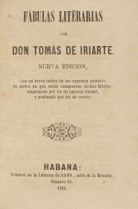 .1865.. LIBRO: .(LITERATURA).. .IRIARTE, TOMAS DE:. .FÁBULAS LITERARIAS POR.... Habana: Librería de Sana, 1865. 8º menor. 84 p. Enc. en cartoné original, cortes jaspeados. Rara edición.