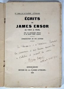 (Ensor & Magritte) - Ens. 2 ouvr. et 1 partition - 2 ouvrages sur Ensor, dont 1 dédicacé, et 1 partition illustrée par Magritte. Écrits de James Ensor de 1921 à 1926, introd. de Fir. Cuypers. Ostende-Bruges, Flandre littéraire, 1926, in-8° br....