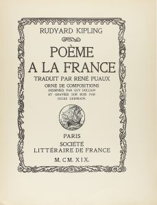 .1919.. LIBRO: .KIPLING, RUDYARD:. .POÈME A LA FRANCE Traduit par René Puaux.... Paris: Sociéte Littéraire de France, 1919. 10 h. Viñetas xilografiadas. Rústica con alguna manchita, falta de papel en la lomera. Tiraje de 150 ejemplares.