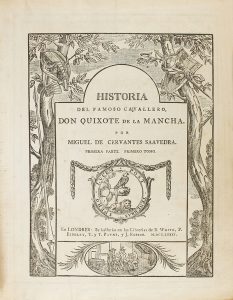 Payne, y J. Robson, 1781. Seis tomos en tres vol. en 4º menor. .I. Primer y segundo tomo:. 3 h. (portadilla, portada y dedicatoria en plancha) + 1 mapa plegado, + XX p.+ 544 p. + 2 h. .II. Tercer y cuarto tomos: .Salisbury: Imp. Eduardo Easton, 1781. VIII p.+ 572 p. + 3 h. LLeva al principio la portada que debiera ir en el segundo tomo del primer vol. (antes de p. 257). .III. Anotaciones e índices: .XXII p. + 157 p. + 167 p. + 4 h. (una es la portada del cuarto tomo, traspuesta) + III p. + 234 h. sin numerar que corresponden al índice de nombres propios. Todas las portadas con orla alegórica y con el pie de imprenta de Salisbury. Varias portadas traspuestas como indicamos. Buen ejemplar. Seis tomos en tres vol. enc. en plena piel de época, con las lomeras y puntas bien restauradas, nervios, tejuelo. Exlibris heráldico en el tercer vol. Es la segunda edición, del mimo año que la primera, pero aumentada y mejorada. Palau dice de ella que se publicó a la vista de las ediciones príncipes ´el reverendo Bowle lo ilustró con anotaciones y estudios de primera mano, que aún hoy conservan interés. Basta consignar que el trabajo de Bowle ha sido fuente inagotable, donde han bebido todos los comentadores del Quijote, la mayoría callando la procedencia y declarándola únicamente los más sinceros.´ Es obra muy rara y más completa, el índice de nombres, que es el tomo sexto, no suele aparecer como aquí. Palau 52025 y 52025-II.