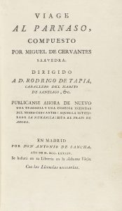 .1784.. LIBRO: .(CERVANTINA).. .CERVANTES SAAVEDRA, MIGUEL DE:. .VIAGE AL PARNASO.. Madrid: Imp. Antonio de Sancha, 1784. 8º mayor. XVI + 384 p. + 3 lám. grabadas por FABREGAT. Enc. en pasta española (puntas rozadas), tejuelo, ruedas, cantos y...