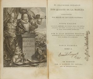 .1797-1798.. LIBRO: .(CERVANTINA).. .CERVANTES, MIGUEL DE:. .EL INGENIOSO HIDALGO DON QUIXOTE DE LA MANCHA COMPUESTO POR.... Madrid: Imp. Gabriel de Sancha, 1797-1798. 5 vol. en 8º. I: Frontis grabado + 8 h. + CCXLIV + 3 grabados. II: 3 h. + 318 p....