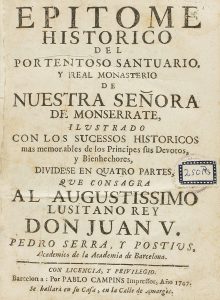.1747.. LIBRO: .(MONTSERRAT).. .SERRA Y POSTIUS, PEDRO:. .EPITOME HISTORICO DEL PORTENTOSO SANTUARIO Y REAL MONASTERIO DE NUESTRA SEÑORA DE MONSERRATE.... Barcelona: Imp. Pablo Campins, 1747. 8º. 24 h. + 500 p. + 18 h. Texto a dos columnas. Puntos...