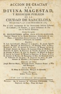 LIBRO: .(BARCELONA).. .ACCION DE GRACIAS A LA DIVINA MAGESTAD Y REGOCIJOS PUBLICOS DE LA CIUDAD DE BARCELONA... POR EL FELIZ NACIMIENTO DE D. CARLOS Y D. FELIPE... Y AJUSTE DEFINITIVO DE LA PAZ CON LA NACION BRITANICA.... Barcelona: Eulalia Piferrer,...