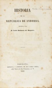 .1849.. LIBRO: .(ANDORRA).. .BAQUER, DALMAU DE:. .HISTORIA DE LA REPÚBLICA DE ANDORRA.. Barcelona: Imp. don Pablo Riera, 1849. 8º mayor. 68 p. Sin el plano. Rústica original. Señal de óxido.