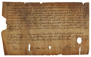.1214.. MANUSCRITO: .(OLOST).. .ESTABLECIMIENTO DEL MAS DE PONS HECHO POR DOLÇA DE VILA RASA, SU HIJO, NUERA Y NIETOS, A FAVOR DE BERNAT DE PEDRÓS Y SU HIJO, AL CENSO DE UNA TACHA Y UNA GALLINA ANUAL.. Manuscrito sobre pergamino, 11,5 x 19 cm. Dado...