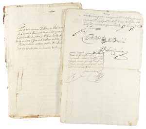 Acreditación del pago de un tributo al Conde de Oropesa. 2 h. escritas en recto y verso. Gerona, 1743: Reconocimiento judicial de los derechos señoriales del Abat de Sant Pere de Galligans.4 h. en papel verjurado, dos de ellas escritas en recto y verso. Sellos estampillados y firmados.