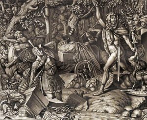 printed wrappers, unbound (uncut). Collection of 17 large and beautiful sepia plates with scenes of the German history, from the Romans untill Rudolf von Habsburg, engraved by Nilson or Meichelt after Eberle, Förster, Kaulbach, Volz and others. fl 17 (sur 24 ?) grandes planches d'histoire allemande en aquatinte, tirées en sépia; avec texte. En ff., sous couv.