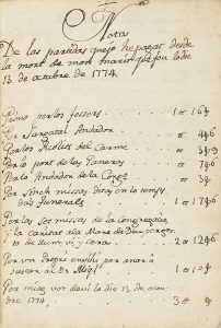 Mitjoude Seriñá. Sigue con anotaciones de otras deudas como la de un arrendamiento del año 1774 de Geroni Subinós de Font Cuberta, masover. Aunque hay varias manos dos son las predominantes. Enc. en pasta española, doble tejuelo.