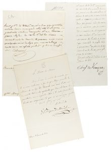 breves sobre cuartilla firmadas ´Cabarrus´. El Duque de Veragua firma en dos documentos de este lote fechados en 1817. Completan el lote dos documentos firmados por el duque de Bailén fechados en 1856 y 1858, uno de ellos es un impreso desde la Mayordomía Mayor, con la firma del valido y el otro está dirigido al Barón de Mora, todo manuscrito y firmado.