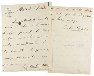 .1869.. MANUSCRITO: .(CARTA AUTÓGRAFA).. .DOS CARTAS EN CUARTILLA DIRIGIDAS A M. COTOULY.. Una de las cartas redactada sobre papel con membrete del congreso de los diputados. Ambas con la firma de Emilio Castelar.
