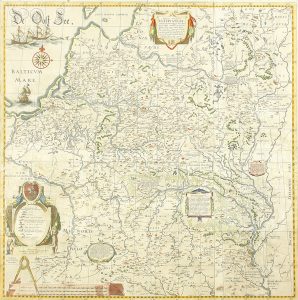 Gerritsz. Huella: 75 x 74 cm, Papel: 94 x 93 cm. Refleja Lituania, partes de Polonia, Rusia, Ucraina y Letonia. Bellamente decorado con varias cartelas, barcos y un compás. Importante mapa, de los primeros de Blaeu, incluído en atlas alrededor de 1630. Mínimas zonas erosionadas con pérdida de dibujo en la zona central.
