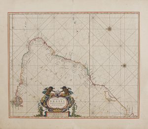 .[1666].. MAPA: .(BRASIL).. .GOOS, PIETER:. .PASKAART VAN BRASIL Van Rio de los Amazones, tot Rio de la Plata.. [Amsterdam, 1666]. Papel: 55 x 64 cm; huella: 45 x 55,5 cm. Mapa grabado al cobre apaisado, en papel de alto gramaje, exquisitamente...